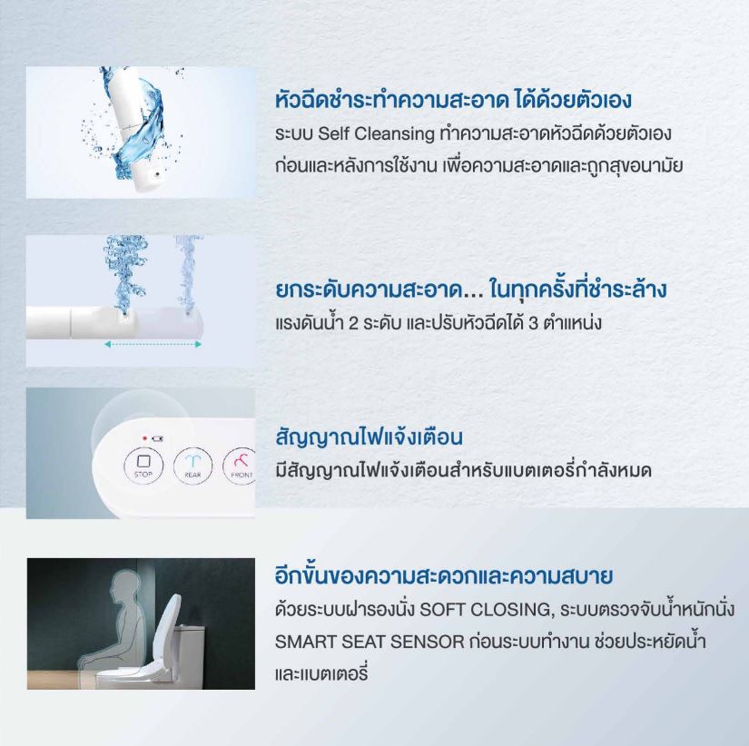 • ระบบตรวจจับน้ําหนักนั่ง (Smart Seat Sensor) ก่อนระบบ ทํางาน ช่วยประหยัดน้ําและแบตเตอรี่